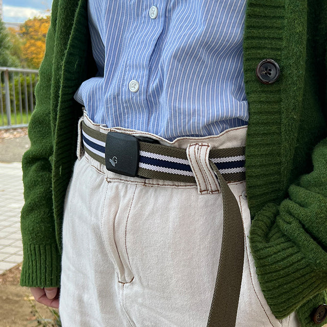6色タイプのストライプ柄にプラスチック素材のバックルを使ったベルトです。アウトドアやカジュアルなファッションで人気があります。プラバックルは軽量で耐久性があり金属バックルのベルトと比べて錆びにくいため、アウトドアやカジュアルなファッションで人気があります。また、金属検知機に引っかからないため空港のセキュリティチェックを通る際も便利です。