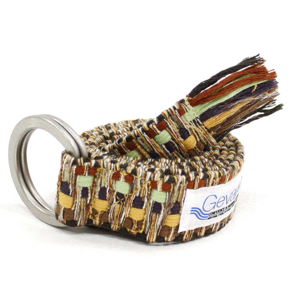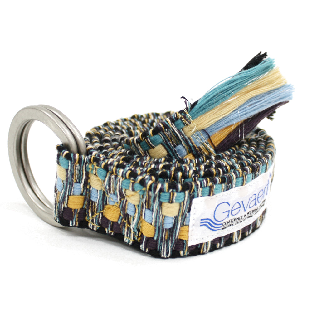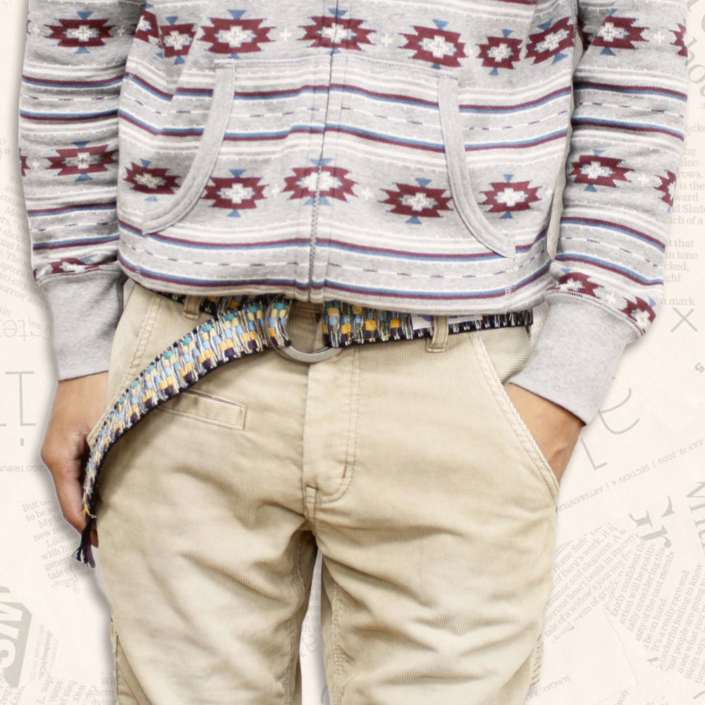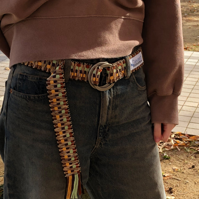 二重のリングを使用して締めるタイプのベルトです。縦に横にといろんな糸を織り込んだ立体的な「シャギーシリーズ」のビビッドタイプです。先がフリンジになっておりラフな感じを出してます。長めに垂らしてもおしゃれです。ベルトの端をリングに通して調整するため、バックルタイプと異なり簡単に長さを自由自在に調整できるのが特徴です。シンプルなスタイルからカジュアルな装いまで幅広いコーディネートに合わせやすく、特にデニムやチノパン、ショートパンツとの相性が良いアイテムです。