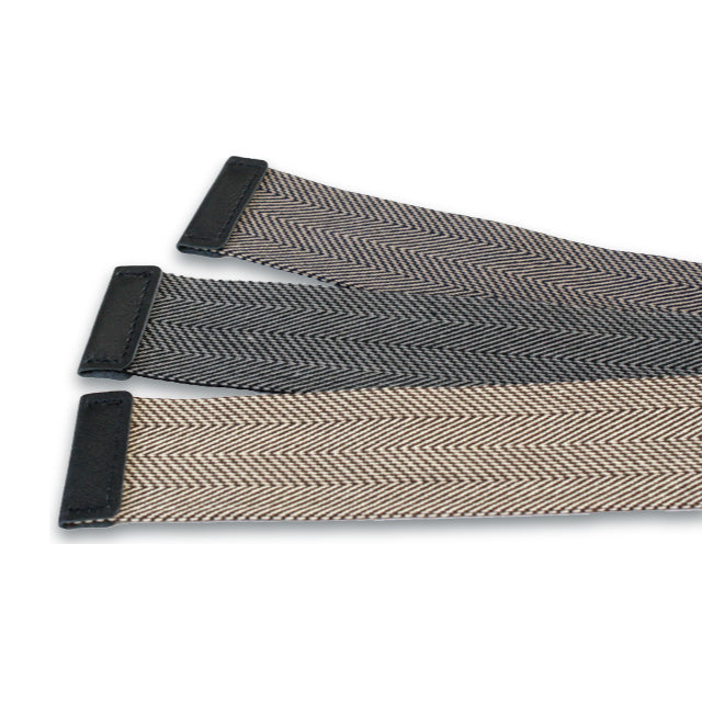 二重のリングを使用して締めるタイプのベルトです。シックなカラーのヘリンボーン柄と無地のリバーシブルのデザインされています。ヘリンボーン柄は縦糸と横糸を交差させながら斜めに配置することでしっかりとした構造と模様を生み出しクラシックかつ上品な印象を与えます。ベルトの端をリングに通して調整するため、バックルタイプと異なり簡単に長さを自由自在に調整できるのが特徴です。クラシカルでありながらさまざまなスタイルに取り入れやすいデザインで幅広いコーディネートに合わせやすく、特にデニムやチノパン、ショートパンツとの相性が良いアイテムです。