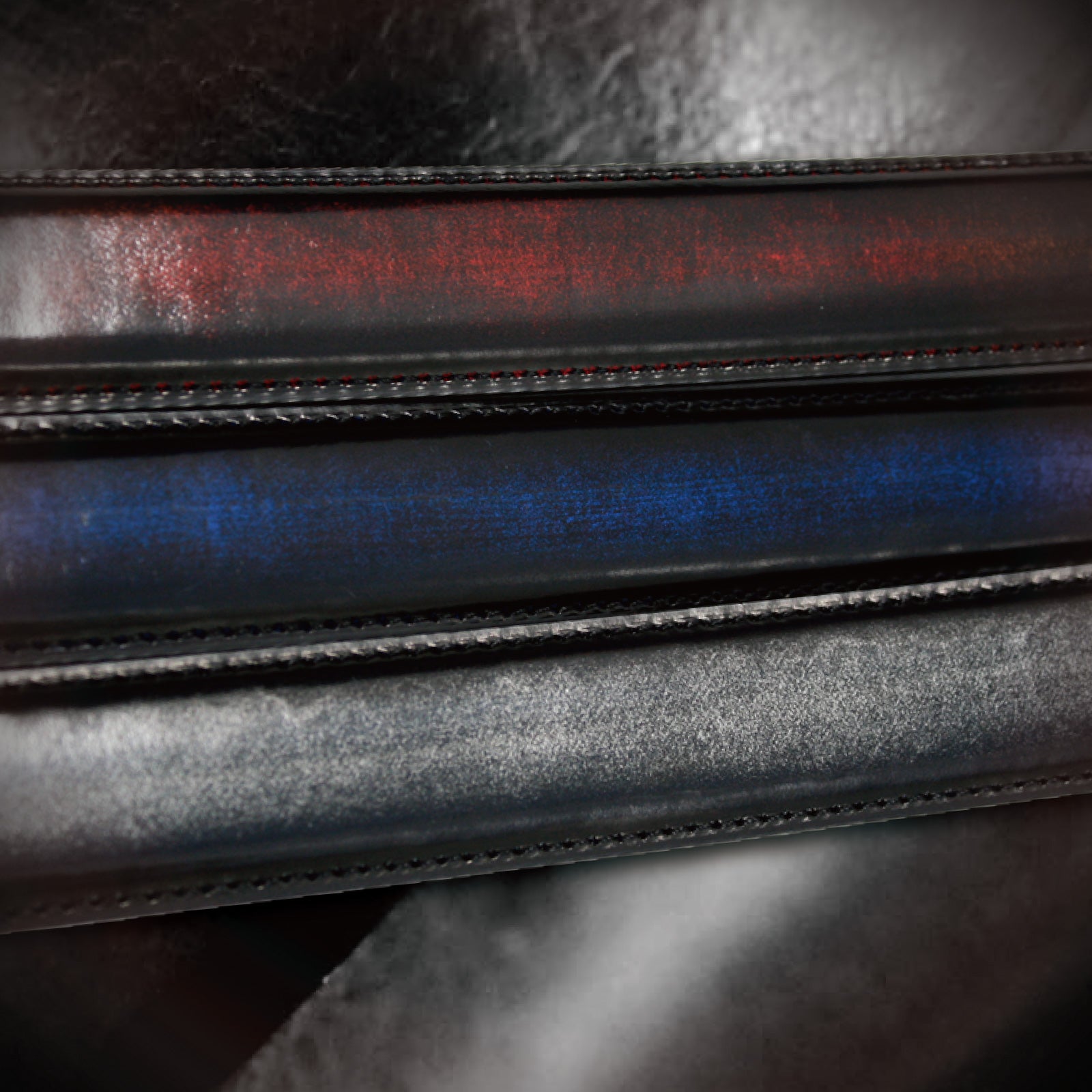革の表面に色ムラと透明感を与えることで角度や光の当たり方によって表情が変わる、奥行きのある艶やかさを実現しています。
