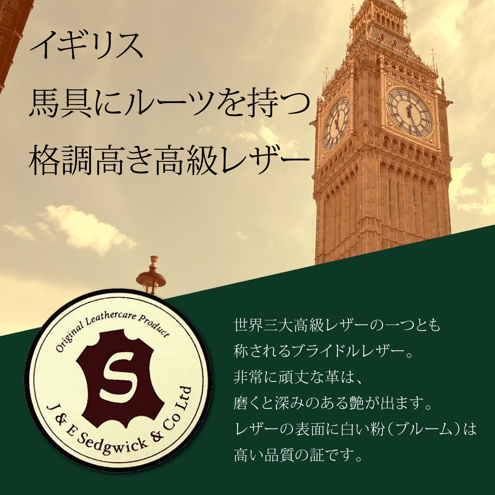 ブライドルレザーは、英国伝統の高級レザーで強靭さと美しい光沢が特徴です。
